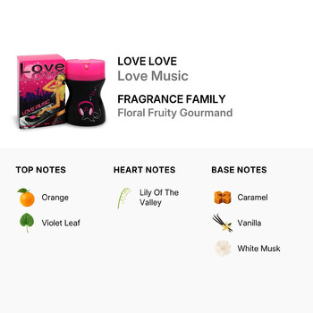 Part of the Floral Fruity Gourmand fragrance family, Love Music opens with fresh top notes of juicy orange and crisp violet leaf, setting the stage for a heart of delicate lily of the valley. As the scent settles, warm base notes of caramel, creamy vanilla, and soft white musk create a comforting and lasting impression that lingers beautifully throughout the day.