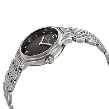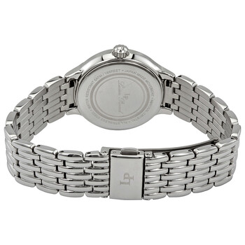 Stainless steel case with a stainless steel bracelet. Fixed stainless steel bezel. Mother of pearl dial with silver sword-shaped hands and crystal hour markers. Arabic numerals mark the 6 and 12 o'clock positions. Dial Type: Analog. Miyota caliber 2035 quartz movement with a 3 year batter life. Scratch resistant mineral crystal. Pull / push crown. Solid case back. Round case shape. Case size: 32.2 mm. Case thickness: 8.5 mm. Band width: 14 mm. Band length: 7.5 inches. Fold over clasp with a push button release. Water resistant at 50 meters / 165 feet. Functions: hour, minute, second. Ava Series. Casual watch style. Watch label: Japan Movt. Lucien Piccard Ava Mother of Pearl Dial Ladies Watch LP-28022-22MOP.