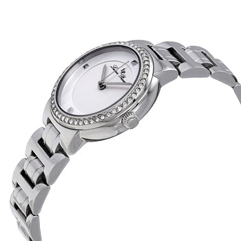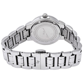 Stainless steel case with a stainless steel bracelet. Fixed stainless steel bezel set with crystals. White dial with silver hands. Pyramid markers at the 3, 6, 9 and 12 o'clock positions. Dial Type: Analog. Hattori calibre VJ21 quartz movement. Scratch resistant mineral crystal. Pull / push crown. Solid case back. Round case shape. Case size: 34 mm. Case thickness: 10.5 mm. Band width: 18 mm. Band length: 7.5 inches. Fold over box clasp with a push button release. Water resistant at 50 meters / 165 feet. Functions: hour, minute, second. Grace Series. Dress watch style. Watch label: Japan Movt. Lucien Piccard Grace White Dial Ladies Watch LP-28024-22S.