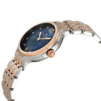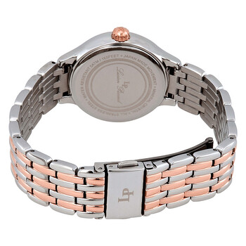 Stainless steel case with a two-tone (silver-tone and rose gold-tone) stainless steel bracelet. Fixed rose gold-tone bezel. Blue dial with rose gold sword-shaped hands and dot hour markers. Arabic numerals appear at the 6 and 12 o'clock positions. Dial Type: Analog. Miyota caliber 2025 quartz movement with a 3 year battery life. Scratch resistant mineral crystal. Pull / push crown. Solid case back. Round case shape. Case size: 31 mm. Case thickness: 9.7 mm. Band width: 16 mm. Band length: 7.5 inches. Fold over clasp with a push button release. Water resistant at 50 meters / 165 feet. Functions: hour, minute. Lauren Series. Casual watch style. Watch label: Japan Movt. Lucien Piccard Lauren Blue Dial Ladies Watch LP-28021-SR-33MOP.