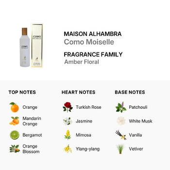 Crafted by Maison Alhambra, a renowned Middle Eastern fragrance house based in the United Arab Emirates, Como Moiselle reflects the brand’s dedication to high-quality ingredients and luxurious design. This fragrance is a celebration of femininity and sophistication, designed for women who embrace their inner strength and grace.