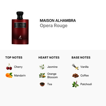 Opera Rouge opens with a delicious burst of cherry and juicy mandarin, creating a fruity and inviting introduction. As the scent unfolds, floral heart notes of jasmine and orange blossom blend seamlessly with a subtle hint of tea, adding depth and sophistication. The fragrance finishes with a warm and sensual base of vanilla, coffee, and patchouli—leaving a smooth yet powerful trail that lingers beautifully on the skin.