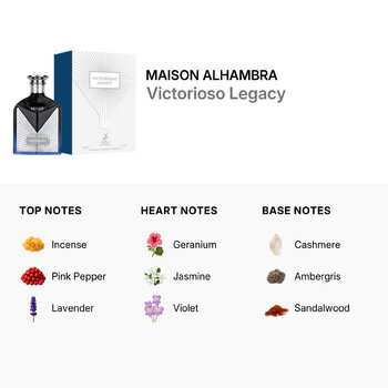 Experience the bold and captivating essence of Victorioso Legacy by Maison Alhambra, a luxurious unisex fragrance that exudes confidence and sophistication. Crafted with precision in the United Arab Emirates, this exquisite Eau de Parfum is a true masterpiece that blends modern elegance with timeless charm.