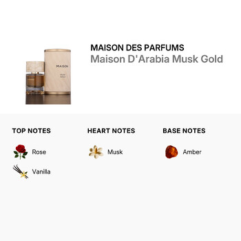Experience the refined elegance of Maison D'Arabia Musk Gold by Maison Des Parfums — a unisex Eau de Parfum that captures the heart of Middle Eastern luxury. Crafted in the United Arab Emirates, this 2.7 oz fragrance opens with a soft blend of delicate rose and creamy vanilla, creating a graceful first impression that is both inviting and indulgent.