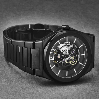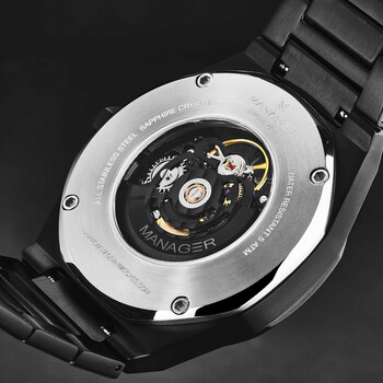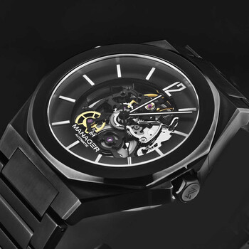 Black stainless steel case and bracelet. Fixed black stainless steel bezel. Black dial with black hands and index hour markers. Dial Type: Analog. Luminescent hands and markers. Automatic movement. Scratch resistant sapphire crystal. Pull / push crown. Transparent case back. Round case shape, case size: 43 mm, case thickness: 11 mm. Band width: 26 mm, band length: 8 inches. Deployment with push button release clasp. Water resistant at 50 meters / 165 feet. Functions: hour, minute, second. Additional Info: hour, minute, second & date. Open Mind Series. Luxury watch style. Watch label: Swiss Made. Manager Open mind Automatic Black Dial Men's Watch MAN-RO-09-NM.