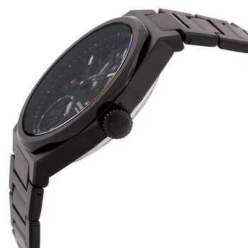 Black stainless steel case and bracelet. Fixed black stainless steel bezel. Black dial with black hands and index hour markers. Minute markers around the outer rim. Dial Type: Analog. Luminescent hands and markers. Hand wind movement. Scratch resistant sapphire crystal. Pull / push crown. Transparent case back. Round case shape, case size: 44 mm, case thickness: 11 mm. Band width: 26 mm, band length: 8 inches. Deployment with push button release clasp. Water resistant at 50 meters / 165 feet. Functions: hour, minute, second. Additional Info: hour, minute + small decentered second. Revolution Series. Luxury watch style. Watch label: Swiss Made. Manager Revolution Hand Wind Black Dial Men's Watch MAN-RM-09-NM.