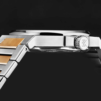 Silver-tone stainless steel case with a two-tone stainless steel bracelet. Fixed silver-tone stainless steel bezel. Black dial with silver-tone hands and index hour markers. Minute markers around the outer rim. Dial Type: Analog. Luminescent hands and markers. Manual wind movement. Scratch resistant sapphire crystal. Pull / push crown. Transparent case back. Round case shape, case size: 44 mm, case thickness: 11 mm. Band width: 26 mm, band length: 8 inches. Deployment with push button release clasp. Water resistant at 50 meters / 165 feet. Functions: hour, minute, second. Additional Info: hour, minute + small decentered second. Revolution Series. Luxury watch style. Watch label: Swiss Made. Manager Revolution Manual Wind Black Dial Men's Watch MAN-RM-06-BM.