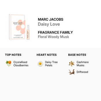 At the top, Daisy Love opens with a burst of crystallised cloudberries, bringing a playful and fruity sparkle. As it settles, delicate daisy tree petals bloom at the heart, adding a soft floral touch that feels light and airy. Finally, warm base notes of cashmere musks and driftwood create a cozy, lingering finish that wraps you in comfort and elegance.