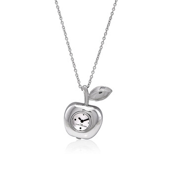 Stainless steel apple-shaped case with a stainless steel necklace. Fixed stainless steel bezel. Silver dial with black hands. Dots set at the 3, 6, 9 and 12 o'clock positions. Dial Type: Analog. Quartz movement. Scratch resistant mineral crystal. Pull / push crown. Solid case back. Unique case shape. Water resistant at 30 meters / 100 feet. Functions: hour, minute. Casual watch style. Marc Jacobs Quartz Silver Dial The Bauble Apple Pendant Ladies Necklace Watch MJ0120179307.