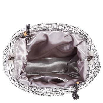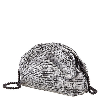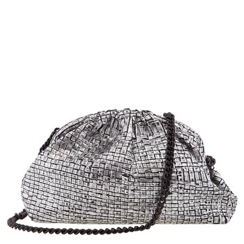Maria La Rosa Ladies Clutch. SKU: BR22.23 MLR-SILVER. Color: Silver. Size: 22 x 16 x 8 cm. Maria La Rosa Mini Game Laminated Clutch Bag. Woven from ribbon fabric, this clutch features a matching chain strap and a main compartment. Material: 100% polyester. Workmanship: hand woven. Lining: 100% viscose satin with patch pocket. Made in Italy.