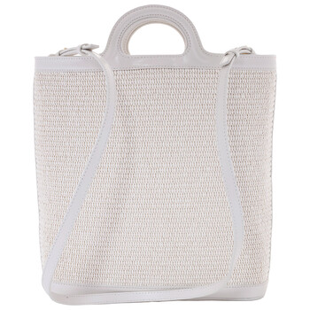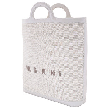Marni Ladies Tote. SKU: SBMP0179Q0-SHELL. Color: Shell. Size: 28 x 30 x 7 cm. Marni Raffia Tropicalia Tote Bag. The Tropicalia Bag features a combination of leather and raffia-effect fabric, embossed handle details, a detachable leather shoulder strap, a sturdy leather bottom, and gold-colored metal accents, with an embroidered logo on the front and a spacious main compartment. 52% Cotton, 48% Polyamide; Details: 100% Leather. Made in Italy.