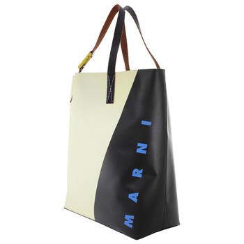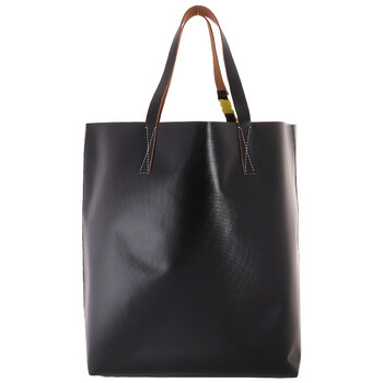 Marni Men's Tote. SKU: SHMQ0037A2-SHELL/BLACK. Color: Shell/Black. Size: 12.75" W x 15.75" H x 6" D. Marni Tribeca Shopping N/S Tote Bag. This Italian-made tote bag features an unlined laminated textile design with leather trim, an open top, a spacious main compartment, and dual leather handles accented with contrast buckled details. Polyurethane 64%, Polyester 36%. Made in Italy.
