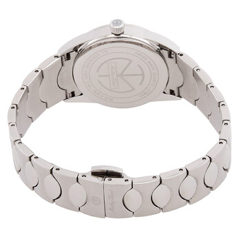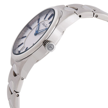 Silver-tone stainless steel case and bracelet. Fixed silver-tone stainless steel bezel. White dial with blue hands and index hour markers. Minute markers around the outer rim. Dial Type: Analog. Luminescent hands and markers. Date display at the 6 o'clock position. Ronda Caliber 714 quartz movement. Scratch resistant mineral crystal. Pull / push crown. Solid case back. Round case shape, case size: 32 mm. Deployment with push button release clasp. Water resistant at 50 meters / 165 feet. Functions: date, hour, minute, second. Anaconda Series. Casual watch style. Watch label: Swiss Made. Mathey-Tissot Anaconda Quartz White Dial Ladies Watch D791AI.
