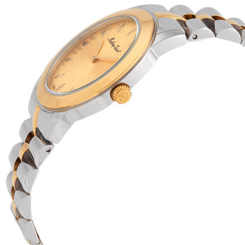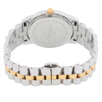 Stainless steel case with a two-tone (silver-tone and yellow gold PVD ) stainless steel bracelet. Fixed yellow gold PVD bezel. Champagne dial with yellow gold-tone hands and index hour markers. Dial Type: Analog. Ronda caliber 1062 quartz movement. Scratch resistant mineral crystal. Pull / push crown. Solid case back. Round case shape. Case size: 32 mm. Fold over clasp with a push button release. Water resistant at 50 meters / 165 feet. Functions: hour, minute. Artemis Series. Casual watch style. Watch label: Swiss Made. Mathey-Tissot Artemis Quartz Champagne Dial Ladies Watch D10860BDI.