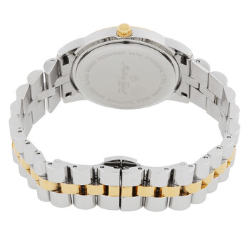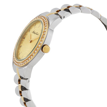 Yellow gold PVD stainless steel case with a two-tone (silver-tone and gold PVD) stainless steel bracelet. Fixed yellow gold PVD bezel set with zirconia crystals. Champagne dial with yellow gold-tone hands and index hour markers. Dial Type: Analog. Ronda 1062 quartz movement. Scratch resistant sapphire coated crystal. Pull / push crown. Solid case back. Round case shape. Case size: 32 mm. Butterfly clasp. Water resistant at 30 meters / 100 feet. Functions: hour, minute. Artemis Series. Casual watch style. Watch label: Swiss Made. Mathey-Tissot Artemis Quartz Crystal Champagne Dial Ladies Watch D10860BQDI.