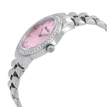 Stainless steel case with a stainless steel bracelet. Fixed stainless steel bezel set with zirconia crystals. Pink dial with silver-tone hands and index hour markers. Dial Type: Analog. Ronda caliber 1062 quartz movement. Scratch resistant mineral crystal. Pull / push crown. Solid case back. Round case shape. Case size: 32 mm. Deployment clasp with a push button release. Water resistant at 50 meters / 165 feet. Functions: hour, minute. Additional Info: zirconia. Artemis Series. Casual watch style. Watch label: Swiss Made. Mathey-Tissot Artemis Quartz Pink Dial Ladies Watch D10860AQPK.