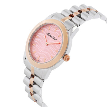 Stainless steel case with a two-tone (silver-tone and rose gold PVD) stainless steel bracelet. Fixed rose gold PVD bezel. Pink dial with rose gold-tone hands and index hour markers. Dial Type: Analog. Ronda caliber 1062 quartz movement. Scratch resistant sapphire coated crystal. Pull / push crown. Solid case back. Round case shape. Case size: 32 mm. Butterfly clasp. Water resistant at 30 meters / 100 feet. Functions: hour, minute. Artemis Series. Dress watch style. Watch label: Swiss Made. Mathey-Tissot Artemis Quartz Pink Dial Ladies Watch D10860BPK.