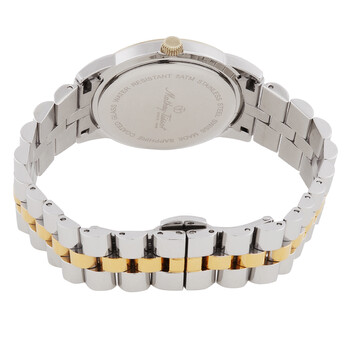 Stainless steel case with a two-tone (silver-tone and yellow gold PVD) stainless steel bracelet. Fixed yellow gold PVD bezel set with zirconia crystals. Silver dial with yellow gold-tone hands and index hour markers. Dial Type: Analog. Ronda caliber 1062 quartz movement. Scratch resistant mineral crystal. Pull / push crown. Solid case back. Round case shape. Case size: 32 mm. Butterfly clasp. Water resistant at 50 meters / 165 feet. Functions: hour, minute. Additional Info: zirconia. Artemis Series. Casual watch style. Watch label: Swiss Made. Mathey-Tissot Artemis Quartz Silver Dial Ladies Watch D10860BQYS.