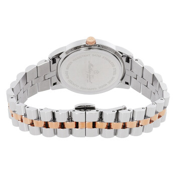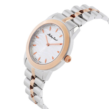 Stainless steel case with a two-tone (silver-tone and rose gold PVD) stainless steel bracelet. Fixed rose gold PVD bezel. Silver dial with rose gold-tone hands and index hour markers. Dial Type: Analog. Ronda caliber 1062 quartz movement. Scratch resistant sapphire coated crystal. Pull / push crown. Solid case back. Round case shape. Case size: 32 mm. Butterfly clasp. Water resistant at 30 meters / 100 feet. Functions: hour, minute. Artemis Series. Dress watch style. Watch label: Swiss Made. Mathey-Tissot Artemis Quartz Silver Dial Ladies Watch D10860BS.