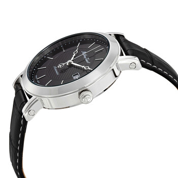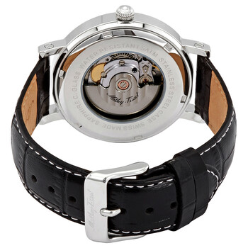 Stainless steel case with a black leather strap. Fixed stainless steel bezel. Black dial with silver-tone hands and index hour markers. Minute markers around the outer rim. Dial Type: Analog. Date display at the 3 o'clock position. STP caliber STP1-11 automatic movement, based upon ETA 2824-2, containing 26 Jewels, bitting at 28800 vph, and has a power reserve of approximately 44 hours. Scratch resistant mineral crystal. Pull / push crown. Transparent case back. Round case shape. Case size: 41 mm. Case thickness: 11 mm. Band width: 17 mm. Tang clasp. Water resistant at 50 meters / 165 feet. Functions: date, hour, minute, second. Casual watch style. Watch label: Swiss Made. Mathey-Tissot City Automatic Black Dial Men's Watch HB611251ATAN.
