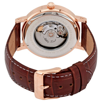 Rose gold PVD stainless steel case with a brown leather strap. Fixed rose gold PVD bezel. White dial with rose gold-tone hands and Roman numeral hour markers. Minute markers around the outer rim. Dial Type: Analog. Date display at the 3 o'clock position. STP caliber STP1-11 automatic movement, based upon ETA 2824-2, containing 26 Jewels, bitting at 28800 vph, and has a power reserve of approximately 44 hours. Scratch resistant mineral crystal. Pull / push crown. Transparent case back. Round case shape. Case size: 41 mm. Case thickness: 11 mm. Band width: 17 mm. Tang clasp. Water resistant at 50 meters / 165 feet. Functions: date, hour, minute, second. Casual watch style. Watch label: Swiss Made. Mathey-Tissot City Automatic White Dial Men's Watch HB611251ATPBR.