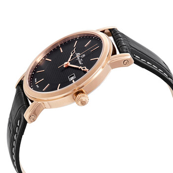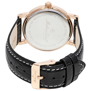 Rose gold PVD stainless steel case with a black leather strap. Fixed rose gold PVD bezel. Black dial with rose gold-tone hands and Arabic numeral hour markers. Minute markers around the outer rim. Dial Type: Analog. Date display at the 3 o'clock position. Ronda caliber 505 quartz movement. Scratch resistant mineral crystal. Pull / push crown. Solid case back. Round case shape. Case size: 38 mm. Case thickness: 7.3 mm. Band width: 19 mm. Tang clasp. Water resistant at 30 meters / 100 feet. Functions: date, hour, minute, second. Casual watch style. Watch label: Swiss Made. Mathey-Tissot City Black Dial Black Leather Men's Watch H611251PN.