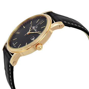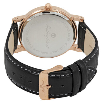 Rose gold PVD stainless steel case with a black leather strap. Fixed rose gold PVD stainless steel bezel. Black dial with rose gold-tone hands and index hour markers. Minute markers around the outer rim. Dial Type: Analog. Date display at the 3 o'clock position. Ronda Caliber 505 quartz movement. Scratch resistant mineral crystal. Pull / push crown. Solid case back. Round case shape, case size: 42 mm, case thickness: 4 mm. Band width: 20 mm. Tang clasp. Water resistant at 30 meters / 100 feet. Functions: date, hour, minute, second. City Series. Casual watch style. Watch label: Swiss Made. Mathey-Tissot City Black Dial Black Leather Men's Watch HB611251PN.
