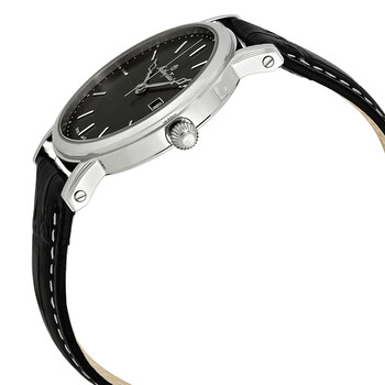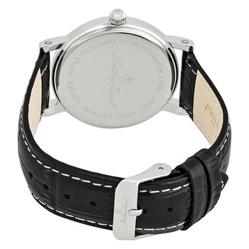 Stainless steel case with a black leather strap. Fixed stainless steel bezel. Black dial with silver-tone hands and index hour markers. Minute markers around the outer rim. Dial Type: Analog. Date display at the 3 o'clock position. Ronda caliber 505 quartz movement. Scratch resistant mineral crystal. Pull / push crown. Solid case back. Round case shape. Case size: 38 mm. Case thickness: 7.3 mm. Band width: 19 mm. Tang clasp. Water resistant at 30 meters / 100 feet. Functions: date, hour, minute, second. Casual watch style. Watch label: Swiss Made. Mathey-Tissot City Black Dial Men's Watch H611251AN.