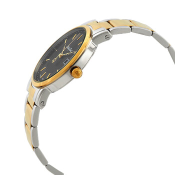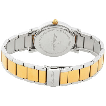 Stainless steel case with a two-tone (silver-tone and yellow gold PVD) stainless steel bracelet. Fixed yellow gold PVD bezel. Black dial with yellow gold-tone hands and index hour markers. Minute markers around the outer rim. Dial Type: Analog. Date display at the 3 o'clock position. Ronda caliber 505 quartz movement. Scratch resistant mineral crystal. Pull / push crown. Solid case back. Round case shape. Case size: 38 mm. Case thickness: 7.3 mm. Deployment clasp. Water resistant at 30 meters / 100 feet. Functions: date, hour, minute, second. City Series. Casual watch style. Watch label: Swiss Made. Mathey-Tissot City Black Dial Men's Watch H611251MBN.