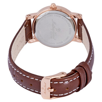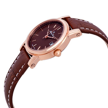 Rose gold PVD stainless steel case with a brown leather strap. Fixed rose gold PVD bezel. Brown dial with rose gold-tone hands and index hour markers. Minute markers around the outer rim. Dial Type: Analog. Date display at the 3 o'clock position. Ronda caliber 775 quartz movement. Scratch resistant mineral crystal. Pull / push crown. Solid case back. Round case shape. Case size: 28 mm. Case thickness: 3 mm. Band width: 12 mm. Tang clasp. Water resistant at 30 meters / 100 feet. Functions: date, hour, minute, second. Casual watch style. Watch label: Swiss Made. Mathey-Tissot City Brown Dial Ladies Watch D31186PM.