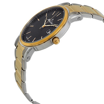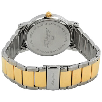 Stainless steel case with a two-tone (silver-tone and yellow gold-plated) stainless steel bracelet. Fixed yellow gold-plated bezel. Black dial with yellow gold-tone hands and index hour markers. Minute markers around the outer rim. Dial Type: Analog. Date display at the 3 o'clock position. Ronda caliber 505 quartz movement. Scratch resistant sapphire glass crystal. Pull / push crown. Solid case back. Round case shape. Case size: 42 mm. Case thickness: 5 mm. Fold over t with push button release clasp. Water resistant at 50 meters / 165 feet. Functions: date, hour, minute, second. City Metal Series. Casual watch style. Watch label: Swiss Movt. Mathey-Tissot City Metal Black Dial Men's Watch HB611251MBN.