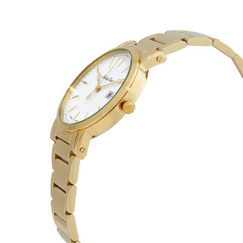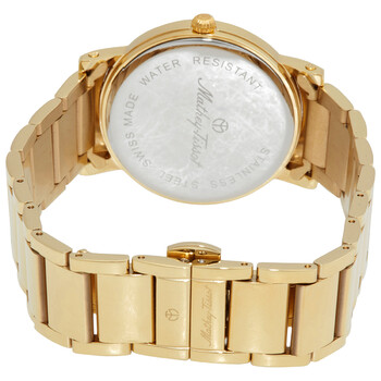 Gold-tone stainless steel case and bracelet. Fixed gold-tone stainless steel bezel. White dial with gold-tone hands and index hour markers. Minute markers around the outer rim. Dial Type: Analog. Date display at the 3 o'clock position. Quartz movement. Scratch resistant sapphire crystal. Pull / push crown. Solid case back. Round case shape. Case size: 38 mm. Case thickness: 7.3 mm. Butterfly clasp. Water resistant at 30 meters / 100 feet. Functions: date, hour, minute, second. City Metal Series. Casual watch style. Watch label: Swiss Made. Mathey-Tissot City Metal Quartz White Dial Ladies Watch H611251MPI.