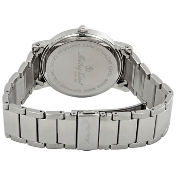 Stainless steel case with a stainless steel bracelet. Fixed stainless steel bezel. White dial with black hands and Arabic numeral hour markers. Minute markers around the outer rim. Dial Type: Analog. Date display at the 3 o'clock position. Ronda caliber 505 quartz movement. Scratch resistant sapphire glass crystal. Pull / push crown. Solid case back. Round case shape. Case size: 42 mm. Case thickness: 5 mm. Fold over clasp with a push button release. Water resistant at 50 meters / 165 feet. Functions: date, hour, minute, second. City Metal Series. Casual watch style. Watch label: Swiss Movt. Mathey-Tissot City Metal White Dial Men's Watch HB611251MAG.