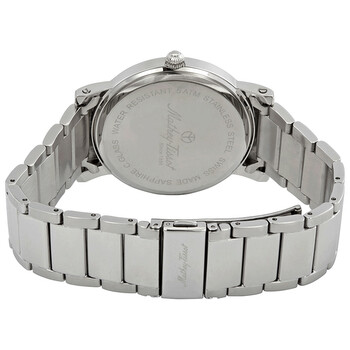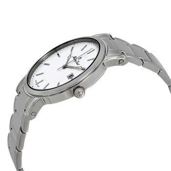 Stainless steel case with a stainless steel bracelet. Fixed stainless steel bezel. White dial with silver-tone hands and index hour markers. Minute markers around the outer rim. Dial Type: Analog. Date display at the 3 o'clock position. Ronda caliber 505 quartz movement. Scratch resistant sapphire glass crystal. Pull / push crown. Solid case back. Round case shape. Case size: 42 mm. Case thickness: 5 mm. Band width: 22 mm. Fold over clasp with a push button release. Water resistant at 50 meters / 165 feet. Functions: date, hour, minute, second. City Metal Series. Casual watch style. Watch label: Swiss Movt. Mathey-Tissot City Metal White Dial Men's Watch HB611251MAI.