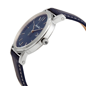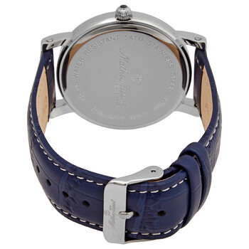 Stainless steel case with a blue leather strap. Fixed stainless steel bezel. Blue dial with silver-tone hands and index hour markers. Minute markers around the outer rim. Dial Type: Analog. Date display at the 3 o'clock position. Ronda caliber 505 H3 quartz movement. Scratch resistant mineral crystal. Pull / push crown. Solid case back. Round case shape. Case size: 42 mm. Tang clasp. Water resistant at 3 meters / 10 feet. Functions: date, hour, minute, second. City Series. Casual watch style. Watch label: Swiss made. Mathey-Tissot City Quartz Blue Dial Men's Watch HB611251ABU.