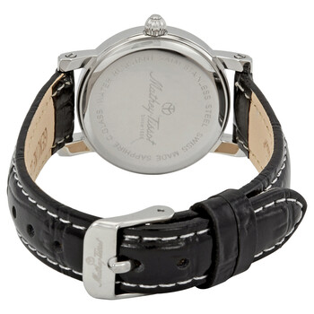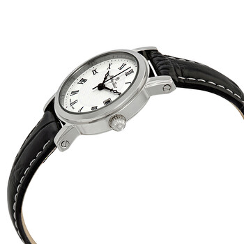 Stainless steel case with a black leather strap. Fixed stainless steel bezel. Silver dial with black hands and Roman numeral hour markers. Minute markers around the outer rim. Dial Type: Analog. Date display at the 3 o'clock position. Ronda caliber 775 quartz movement. Scratch resistant mineral crystal. Pull / push crown. Solid case back. Round case shape. Case size: 28 mm. Case thickness: 3 mm. Strap width: 14 mm. Tang clasp. Water resistant at 30 meters / 100 feet. Functions: date, hour, minute, second. Casual watch style. Watch label: Swiss Made. Mathey-Tissot City Silver Dial Ladies Watch .