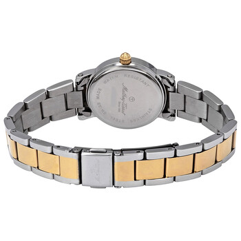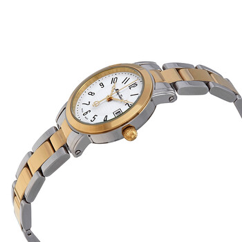Stainless steel case with a two-tone (silver-tone and yellow gold PVD) stainless steel bracelet. Fixed yellow gold PVD bezel. Silver-tone dial with yellow gold-tone hands and Arabic numeral hour markers. Minute markers around the outer rim. Dial Type: Analog. Date display at the 3 o'clock position. Ronda caliber 775 quartz movement. Scratch resistant sapphire crystal. Pull / push crown. Solid case back. Round case shape. Case size: 28 mm. Case thickness: 3 mm. Band width: 14 mm. Deployment clasp. Water resistant at 30 meters / 100 feet. Functions: date, hour, minute, second. Casual watch style. Watch label: Swiss Made. Mathey-Tissot City Silver Dial Two-tone Ladies Watch D31186MBG.
