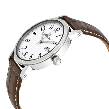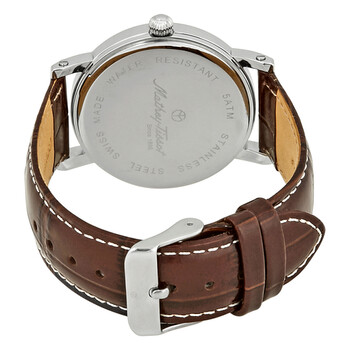 Silver-tone stainless steel case with a brown leather strap. Fixed silver-tone stainless steel bezel. White dial with silver-tone hands and Arabic numeral hour markers. Minute markers around the outer rim. Dial Type: Analog. Date display at the 3 o'clock position. Ronda Caliber 505 quartz movement. Scratch resistant mineral crystal. Pull / push crown. Solid case back. Round case shape, case size: 38 mm, case thickness: 7.3 mm. Band width: 19 mm. Tang clasp. Water resistant at 30 meters / 100 feet. Functions: date, hour, minute, second. City Series. Casual watch style. Watch label: Swiss Made. Mathey-Tissot City White Dial Brown Leather Men's Watch H611251AG.