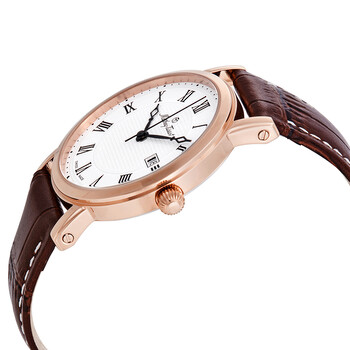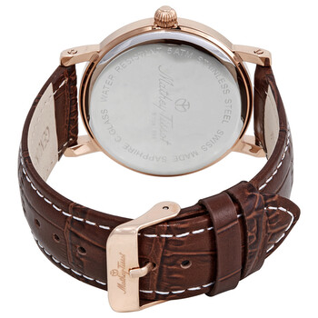 Rose gold PVD stainless steel case with a brown leather strap. Fixed rose gold PVD bezel. White dial with black hands and Roman numeral hour markers. Minute markers around the outer rim. Dial Type: Analog. Date display at the 3 o'clock position. Quartz movement. Scratch resistant mineral crystal. Pull / push crown. Solid case back. Round case shape. Case size: 38 mm. Case thickness: 7.3 mm. Band width: 19 mm. Tang clasp. Water resistant at 30 meters / 100 feet. Functions: date, hour, minute, second. Casual watch style. Watch label: Swiss Made. Mathey-Tissot City White Dial Brown Leather Watch H611251PBR.