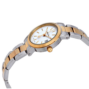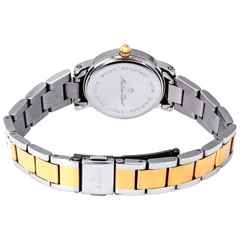 Stainless steel case with a two-tone (silver-tone and gold PVD) stainless steel bracelet. Fixed gold PVD bezel. White dial with gold-tone hands and index hour markers. Minute markers around the outer rim. Dial Type: Analog. Date display at the 3 o'clock position. Ronda caliber 775 quartz movement. Scratch resistant mineral crystal. Pull / push crown. Solid case back. Round case shape. Case size: 28 mm. Case thickness: 8mm. Band width: 13 mm. Fold over clasp with a push button release. Water resistant at 30 meters / 100 feet. Functions: date, hour, minute, second. City Series. Casual watch style. Watch label: Swiss Made. Mathey-Tissot City White Dial Ladies Watch D31186MBI.