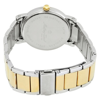 Stainless steel case with a two-tone (silver-tone and yellow gold PVD) stainless steel bracelet. Fixed yellow gold PVD bezel. White dial with gold-tone hands and index hour markers. Minute markers around the outer rim. Dial Type: Analog. Date display at the 3 o'clock position. Ronda caliber 505 quartz movement. Scratch resistant mineral crystal. Pull / push crown. Solid case back. Round case shape. Case size: 38 mm. Case thickness: 7.3 mm. Band width: 20 mm. Fold over clasp with a push button release. Water resistant at 30 meters / 100 feet. Functions: date, hour, minute, second. Casual watch style. Watch label: Swiss Made. Mathey-Tissot City White Dial Men's Watch H611251MBI.