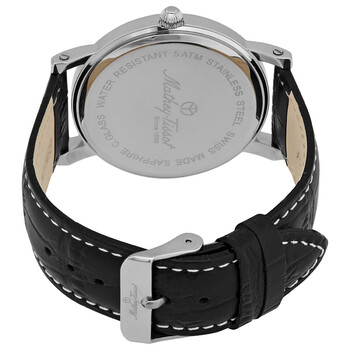 Stainless steel case with a black leather strap. Fixed stainless steel bezel. White dial with black hands and Roman numeral hour markers. Minute markers around the outer rim. Dial Type: Analog. Date display at the 3 o'clock position. Ronda caliber 505 quartz movement. Scratch resistant mineral crystal. Pull / push crown. Solid case back. Round case shape. Case size: 8.8 mm. Case thickness: 4 mm. Band width: 22 mm. Tang clasp. Water resistant at 30 meters / 100 feet. Functions: date, hour, minute, second. City Series. Casual watch style. Watch label: Swiss Made. Mathey-Tissot City White Dial Men's Watch HB611251ABR.