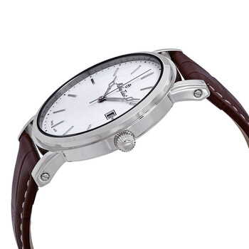 Stainless steel case with a brown leather strap. Fixed stainless steel bezel. White dial with silver-tone hands and index hour markers. Minute markers around the outer rim. Dial Type: Analog. Date display at the 3 o'clock position. Quartz movement. Scratch resistant mineral crystal. Pull / push crown. Solid case back. Round case shape. Case size: 42 mm. Band width: 20 mm. Tang clasp. Water resistant at 30 meters / 100 feet. Functions: date, hour, minute, second. Casual watch style. Watch label: Swiss Made. Mathey-Tissot City White Dial Men's Watch HB611251AI.