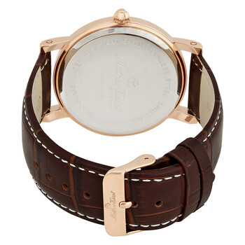 Rose gold PVD stainless steel case with a brown leather strap. Fixed rose gold PVD bezel. White dial with black hands and Arabic numeral hour markers. Minute markers around the outer rim. Dial Type: Analog. Date display at the 3 o'clock position. Ronda caliber 505 quartz movement. Scratch resistant mineral crystal. Pull / push crown. Solid case back. Round case shape. Case size: 42 mm. Case thickness: 4 mm. Band width: 20 mm. Tang clasp. Water resistant at 30 meters / 100 feet. Functions: date, hour, minute, second. Casual watch style. Watch label: Swiss Made. Mathey-Tissot City White Dial Men's Watch HB611251PG.