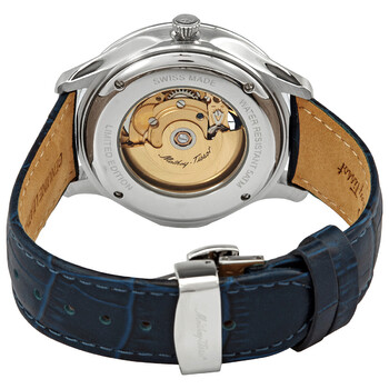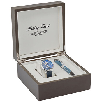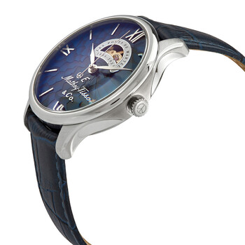 Stainless steel 316L case with a blue leather strap. Fixed stainless steel bezel. Blue (open heart) dial with silver-tone hands and index hour markers. Roman numerals appear at the 3, 6, 9 and 12 o'clock positions. Dial Type: Analog. Peseux caliber P225 automatic movement with a 38-hour power reserve. Scratch resistant sapphire crystal. Pull / push crown. Transparent case back. Round case shape. Case size: 42 mm. Case thickness: 11 mm. Tang clasp. Water resistant at 50 meters / 165 feet. Functions: hour, minute, second. Additional Info: open heart. Edmond Series. Dress watch style. Watch label: Swiss Made. Mathey-Tissot Edmond Automatic Blue Dial Men's Watch MC1886ABU.
