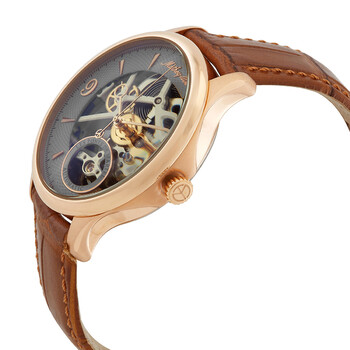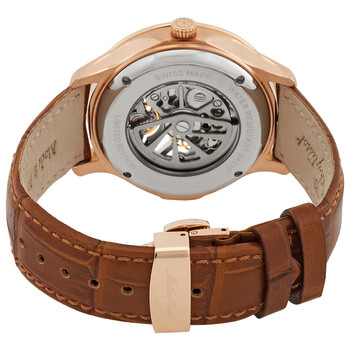 Rose gold PVD stainless steel case with a brown leather strap. Fixed rose gold PVD stainless steel bezel. Silvery dial with rose gold-tone hands and index-Arabic numeral hour markers. Arabic numeral marks the 3 and 9 o'clock positions. Minute markers around the outer rim. Dial Type: Analog. Automatic movement. Scratch resistant sapphire crystal. Pull / push crown. Transparent case back. Round case shape, case size: 42 mm, case thickness: 11 mm. Deployment buckle clasp. Water resistant at 50 meters / 165 feet. Functions: hour, minute, second. Edmond Series. Casual watch style. Watch label: Swiss Made. Mathey-Tissot Edmond Automatic Skeleton Dial Men's Watch MC1886SKPA.