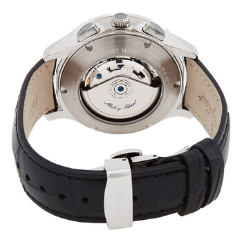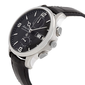 Stainless steel case with a black leather strap. Fixed stainless steel bezel. Black dial with silver-tone hands and index hour markers. Arabic numerals appear at the 3, 6, 9 and 12 o'clock positions. Minute markers around the outer rim. Dial Type: Analog. Day of the week and date display at the 3 o'clock position. Landeron 77 automatic movement. Scratch resistant mineral crystal. Pull / push crown. Transparent case back. Round case shap. Case size: 42 mm. Case thickness: 13 mm. Butterfly clasp. Water resistant at 50 meters / 165 feet. Functions: chronograph, day, date, hour, minute, second. Additional Info: dome glass. Edmond Chrono Automatic Series. Casual watch style. Watch label: Swiss Made. Mathey-Tissot Edmond Chrono Automatic Chronograph Black Dial Men's Watch H1886CHATAN.