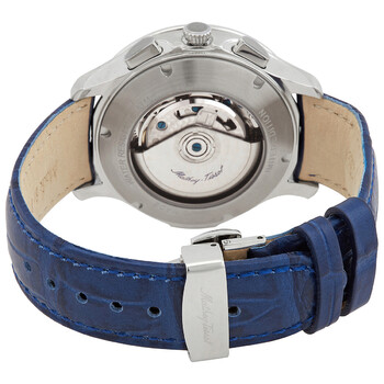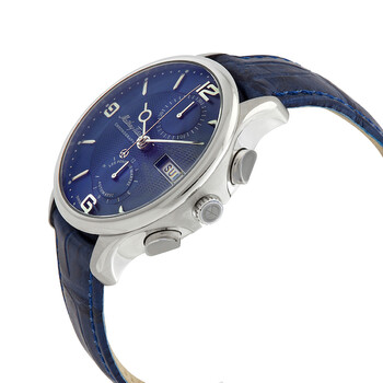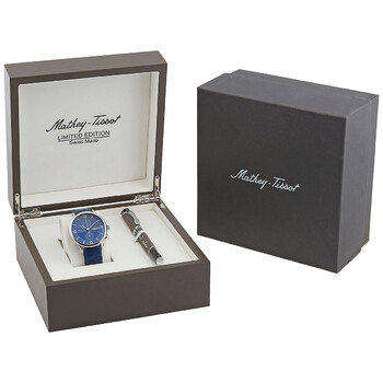 Stainless steel case with a blue leather strap. Fixed stainless steel bezel. Blue dial with silver-tone hands and index hour markers. Arabic numerals appear at the 3, 6, 9 and 12 o'clock positions. Minute markers around the outer rim. Dial Type: Analog. Day of the week and date display at the 3 o'clock position. Chronograph - two sub-dials displaying: 30 minutes and 12 hours. Landeron 77 automatic movement. Scratch resistant mineral crystal. Pull / push crown. Transparent case back. Round case shape. Case size: 42 mm. Tang clasp. Water resistant at 50 meters / 165 feet. Functions: chronograph, day, date, hour, minute, second. Additional Info: dome glass. Edmond Chrono Automatic Series. Casual watch style. Watch label: Swiss Made. Mathey-Tissot Edmond Chrono Automatic Chronograph Blue Dial Men's Watch H1886CHATABU.