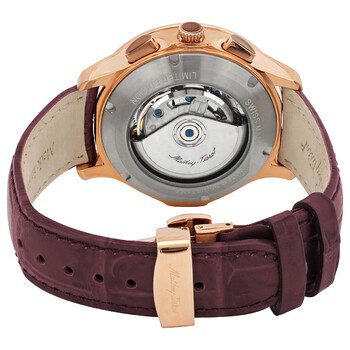 Rose gold-tone stainless steel case with a purple leather strap. Fixed rose gold-tone bezel. Purple dial with rose gold-tone hands and index hour markers. Arabic numerals appear at the 3, 6, 9 and 12 o'clock positions. Minute markers around the outer rim. Dial Type: Analog. Day of the week and date display at the 3 o'clock position. Chronograph - two sub-dials displaying: 30 minutes and 12 hour. Landeron 77 automatic movement with a 43-hour power reserve. Scratch resistant mineral crystal. Pull / push crown. Transparent case back. Round case shape. Case size: 42 mm. Case thickness: 13 mm. Butterfly clasp. Water resistant at 50 meters / 165 feet. Functions: chronograph, day, date, hour, minute, second. Additional Info: dome glass. Edmond Chrono Automatic Series. Casual watch style. Watch label: Swiss Made. Mathey-Tissot Edmond Chrono Automatic Chronograph Purple Dial Men's Watch H1886CHATPR.