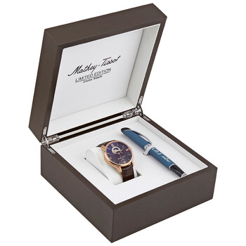 Rose gold-tone stainless steel case with a brown leather strap. Fixed rose gold-tone bezel. Brown scale (open heart) dial with rose gold-tone hands and index hour markers. Roman numerals appear at the 3, 6, 9 and 12 o'clock position. Dial Type: Analog. Peseux P225 automatic movement with a 38-hour power reserve. Scratch resistant antireflex sapphire crystal. Pull / push crown. Transparent case back. Round case shape. Case size: 42 mm. Case thickness: 11 mm. Band width: 20 mm. Deployment clasp. Water resistant at 50 meters / 165 feet. Functions: hour, minute, second. Additional Info: limited edition of 99 pieces. Edmond Le Open Heart Series. Casual watch style. Watch label: Swiss Made. Mathey-Tissot Edmond LE Open Heart Automatic Men's Watch MC1886PI.